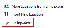 - Click on the Insert tab, locate the Symbols toolbar, click on the Equation drop-down menu, and then select Ink Equation.