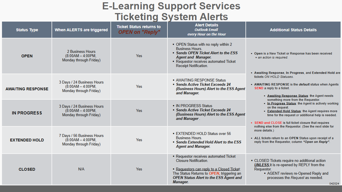 Closed Ticket Status: Inactive...- Closed - Ticket requires no additional action unless it is reopened upon the requester's reply.